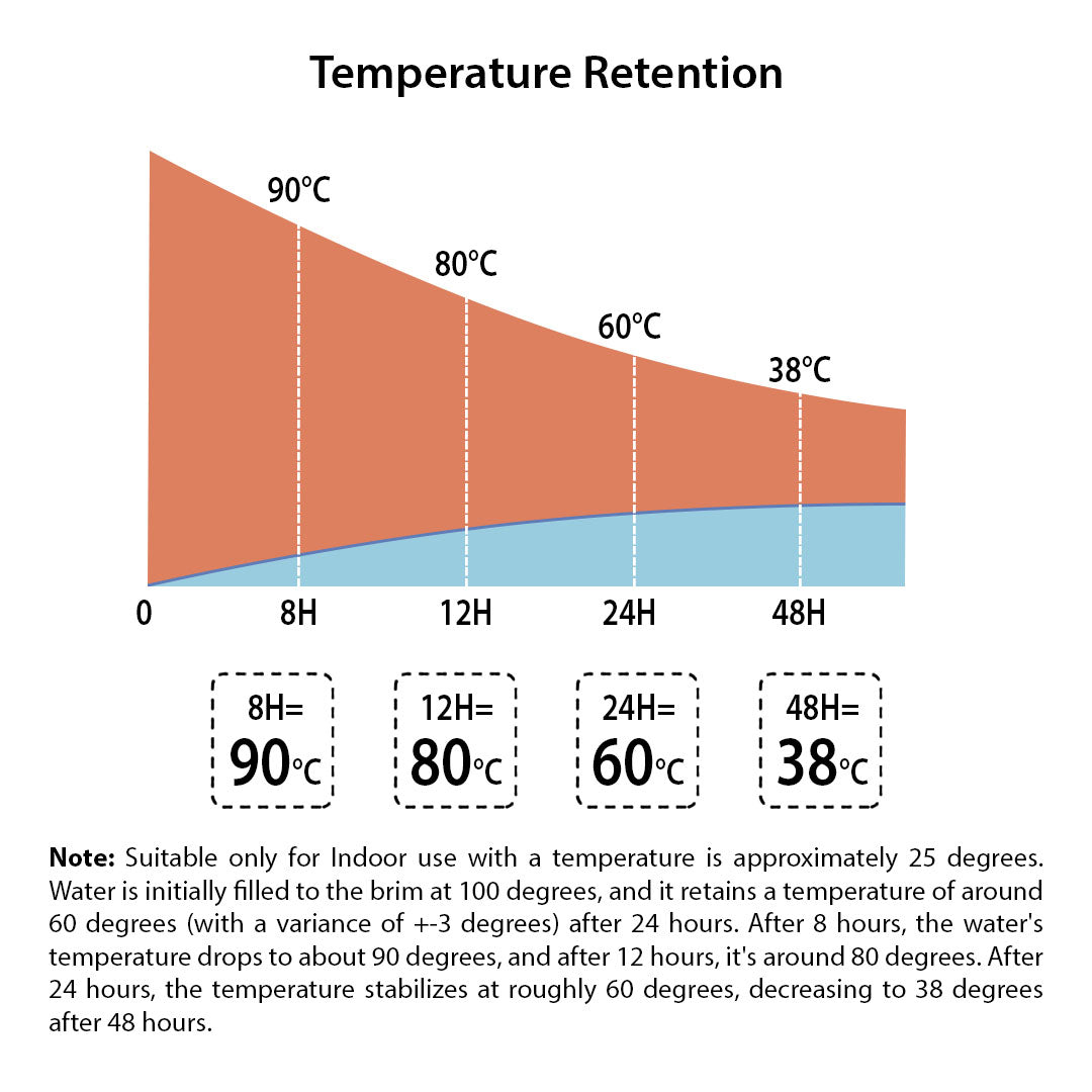 - Note: Suitable only for Indoor use with a temperature is approximately 25 degrees. Water is initially filled to the brim at 100 degrees, and it retains a temperature of around 60 degrees (with a variance of +-3 degrees) after 24 hours. After 8 hours, the water's temperature drops to about 90 degrees, and after 12 hours, it's around 80 degrees. After 24 hours, the temperature stabilizes at roughly 60 degrees, decreasing to 38 degrees after 48 hours.