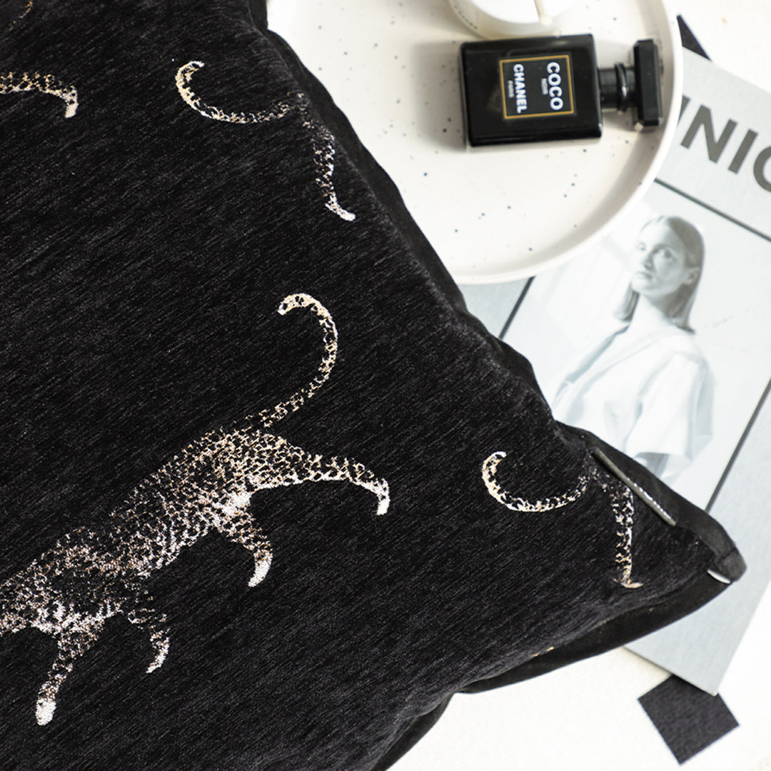 - Add a touch of sophistication to your home with this black cushion cover, adorned with shimmering embroidered panther motifs. The luxurious fabric offers both style and comfort, making it a perfect addition to any contemporary or eclectic decor. Pair it with your favorite chair, sofa, or bed for a striking yet cozy look.