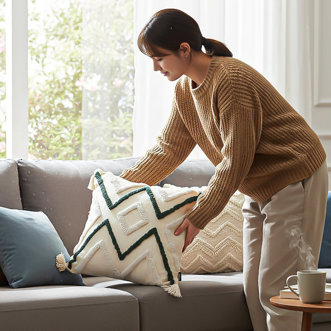 • Boho Design: Features a chic geometric chevron pattern with textured tufting for a stylish, artisanal look. • Premium Material: Made of high-quality polyester that’s soft, durable, and easy to maintain. • Versatile Decor: Perfect for living rooms, bedrooms, lounges, or office seating areas. • Tassel Detailing: Elegant tassels on each corner add a touch of sophistication and movement. • Comfort and Support: Provides excellent cushioning for relaxation and back support. • Easy Care: Removable cover allows for convenient cleaning and maintenance.