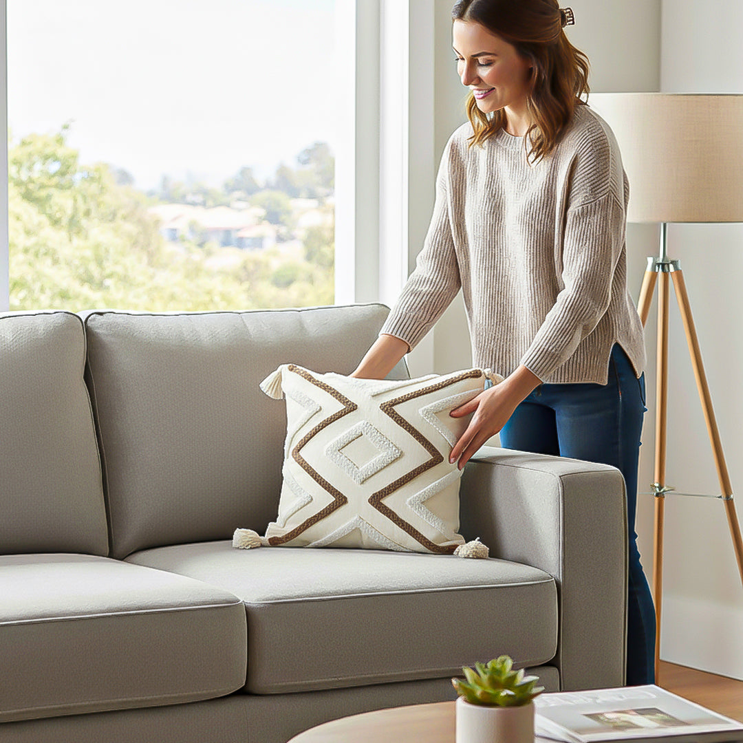 • Boho-Inspired Design: Features a white and brown geometric pattern with charming tassels for a warm, cozy look. • Premium Material: Made from high-quality polyester that is soft, durable, and easy to maintain. • Comfort and Support: Provides excellent comfort for lounging, reading, or relaxing. • Versatile Decor: Perfect for bedrooms, living rooms, or office spaces to elevate your interior style. • Easy to Clean: Removable cover allows for effortless washing and care. • Perfect Size: Ideal 45cm x 45cm dimension fits most standard cushions and complements any decor setup.